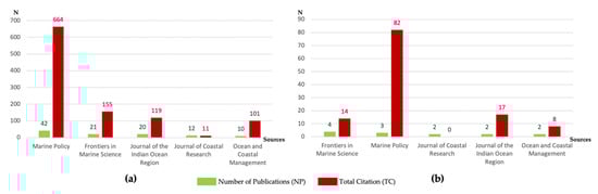Figure 4 shows the relation between the number of publications (NP) and the number of total citations (TC) for sources in the two scientific fields (i.e., BE and coastal tourism). The total citations of the sources did not correspond to the order in which they appeared in the most productive sources list, whether for BE or coastal tourism. For instance, in the BE scientific field, Ocean and Coastal Management received 101 citations obtained by only 10 published articles and ranked fifth in terms of the total number of citations for sources (see Figure 4a). Furthermore, Journal of the Indian Ocean Region published two articles in the coastal tourism scientific research area, which were cited 17 times, while Frontiers in Marine Science journal published four articles in the same research area and received just 14 citations (see Figure 4b).