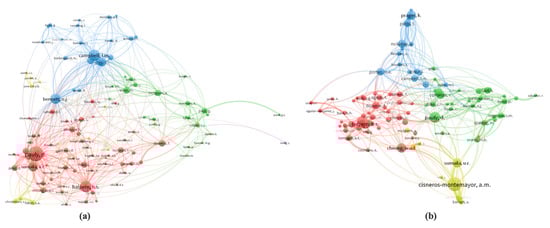 Figure 5b presents the author collaboration network in the coastal tourism field. It also has four main clusters: red, blue, green, and yellow. Unlike in the network in BE, it was found that most authors in the coastal tourism sector collaborated within the same cluster, resulting in a less tangled network with clean visualization and divided into four separate groups. This network in Figure 5b also shows a clear collaboration between the most productive authors in the coastal tourism sector and the same cluster, similar to the BE author collaboration network.