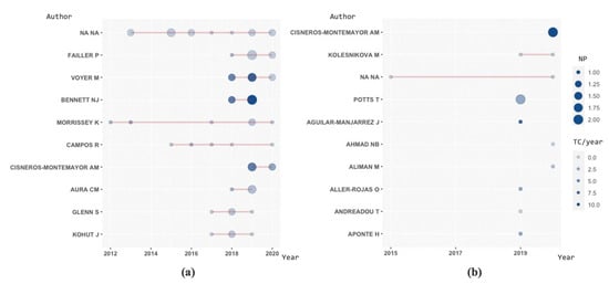 Author scientific production over time; (a) BE scientific field; (b) coastal tourism scientific field. Legend: Line: represents author’s publishing timeline; Bubble Size: represents proportional to NP; Bubble Color Intensity: represents proportional to TC/year. Note: NP: number of publications; TC: total citations. Source: researcher, derived from R Programming Language (bibliometrix package).