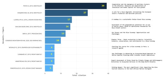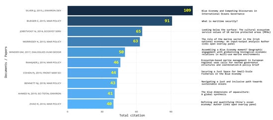 Firstly, by analyzing and extracting the 10 most cited papers published in the BE scientific area, we saw that the highest number of citations was 109, which was obtained by Silver JJ’s research paper entitled “Blue Economy and Competing Discourses in International Oceans Governance” [5]. Bueger C’s article entitled “What is maritime security?” [56] ranked second in the most cited papers in BE academic production, and it received around 91 citations. These two published papers achieved approximately 8% of the total citations obtained by all research papers in BE, and it is worth noting that these two papers were also published in the same year, 2015. One of the most intriguing observations from the list of the top 10 most cited articles in BE was that half of the list (n = 5) was published in one journal, Marine Policy. These five papers were in the second [5], fourth [57], sixth [58], eighth [59], and tenth rank of the list [60] (see Figure 7).