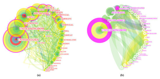 Country collaboration network. (a) BE scientific field; (b) coastal tourism scientific field. Legend: Node: represents countries (the size of the node represents the country’s scientific production); Link: represents collaborative relations between countries; Colors: represent the temporal orders of co-occurrence links between countries (outside purple circle represents nodes with centrality above 0.1/key hub countries). Source: researcher, derived from CiteSpace.