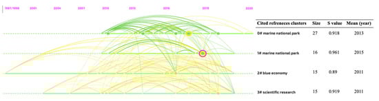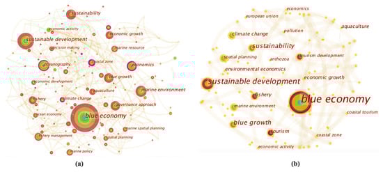 In general, keywords are considered to be one of the most important components of any research paper that aims to identify the core research topics in different scientific research fields [65]. In biometric analysis, there are two types of keywords: (i) Author’s Keywords (DE) that are provided by authors, and (ii) Keywords Plus (ID), those produced by bibliometrics analysis software based on computer algorithms [67]. These two keyword categories were combined and analyzed together. Using CiteSpace software, the co-word analysis networks were mapped based on keywords frequency in the two studied research areas (BE and coastal tourism). Figure 10a shows the co-word analysis of BE literature; it shows that the most frequent keywords were blue economy (n = 197), sustainable development (n = 78), sustainability (n = 44), marine environment (n = 44), economics (n = 38), oceanography (n = 32), fishery (31), and blue growth (n = 30). This network also shows that the keywords that form the main conceptual kernel of BE, such as economy and sustainability, were ranked at the top of the most frequent keywords; this emphasizes the novelty of the BE scientific area, which has been under research since the term’s appearance in 2012. It also appears in this network that there was a clear absence of keywords that referred to coastal tourism, despite its importance as one of the most economically valuable BE sectors, as mentioned previously.