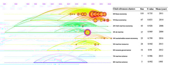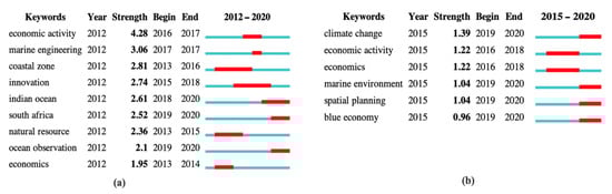 Burst term represents the sudden increase in using a keyword or citing a paper for a certain period of time, and it is vital to identify the research frontier for the focused scientific field [68]. Figure 11a shows a list of nine keywords extracted from BE literature and ranked by the strength of citation burst. The red lines refer to the keyword citation burst, while blue lines refer to the time. In BE scientific production, the top three keywords with the strongest citation bursts were economic activity (4.28), marine engineering (3.06), and coastal zone (2.81). Moreover, by looking to the time period columns in Figure 11a, it can be seen that the early papers published after the emergence of the BE term in 2012 were focused on the main BE pillars. For example, the keywords with the strongest citation bursts were coastal zone and natural resource. Recent studies have discussed the spatial dimension of the BE approach, where the strongest citation burst keywords were Indian Ocean and South Africa, and this depicts the development of BE research frontiers.