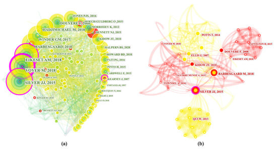 Figure 5a presents the author collaboration network in the BE field, consisting of four primary colors: red, blue, green, and yellow; every color represents a cluster of authors with the same disciplinary area of interest under the BE umbrella. By examining this network, we can see that there was little interest from authors in the BE field to collaborate within different disciplinary boundaries. It was shown through the tangled links in the network between different clusters. In addition, the collaboration between some researchers from different groups was observed, such as the collaboration between Voyer M (green group) and Heron RL (blue cluster) and the collaboration between Foulton EA (yellow group) and the Cheung WWL (red group). It was noteworthy that most of the strong relationships that appeared from the link thickness were within the same cluster, indicating the extent of the excellent collaboration between authors in the same group to produce co-authored articles. Moreover, it is worth mentioning that there was an amazing collaboration between the most prolific authors (big nodes) in the BE field but inside the same cluster.
