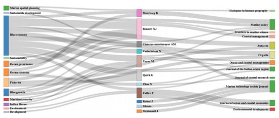 With regards to source analysis in BE, the extracted 476 papers were reported in 249 sources. Marine Policy/H-index (15), Frontiers in Marine Science/H-index (6), Journal of the Indian Ocean Region/H-index (7), Journal of Coastal Research/H-index (2), and Ocean and Coastal Management/H-index (5), were the most productive sources in the BE research area, with 42, 21, 20, 12 and 10 publications, respectively (see Figure 4). Although within the broad range of the published articles’ sources in the BE scientific field during the eight years only 5% (n = 12) sources had published more than five articles, which represented by the top five sources in addition to Sea Technology (NP = 10), Sustainability Science (NP = 10), Marine Technology Society Journal (NP = 9), Maritime Affairs (NP = 8), Dialogues in Human Geography (NP = 7), Journal of Political Ecology (NP = 7), and Journal of Ocean and Coastal Economics (NP = 6).