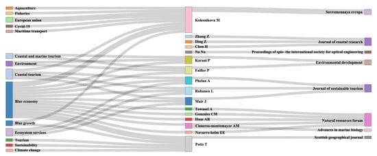 Comparing the most productive sources in the two studied scientific areas (BE and coastal tourism), it was obvious that there was a great similarity between them, where Marine Policy, Journal of Coastal Research, Journal of the Indian Ocean Region, and Ocean and Coastal Management were the most productive sources in these two research areas (see Figure 4). However, in the coastal tourism sector, Journal Frontiers in Marine Science ranked at the top of the most productive journal list in this field, which was not recorded in the same list for the BE field, indicating the specialization of this journal in publishing articles related to coastal tourism among all other sources.
