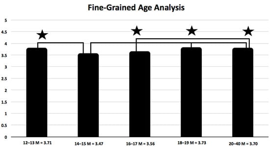 Bonferroni post hoc tests revealed a nonlinear relationship between age and ECN. Those within the youngest age group (M = 3.71, SD = 0.54) differed significantly in their levels of ECN from those that were in the 14–15 age group (M = 3.47, SD = 0.57), but not from the older three age groups (M = 3.56, SD = 0.60; M = 3.73, SD =.50; M = 3.70, SD = 0.55). Findings also revealed that those in the 14–15 age group (M = 3.47, SD = 0.57) differed significantly from those who were 18–19 age group, as well as from those in the 20–40 age group (M = 3.73, SD =.50; M = 3.70, SD = 0.55). Those in the 16–17 age group (M = 3.56, SD = 0.60) differed significantly from those in the 20–40 age group (M = 3.70, SD = 0.55). No other age differences between the five age groups were significant.