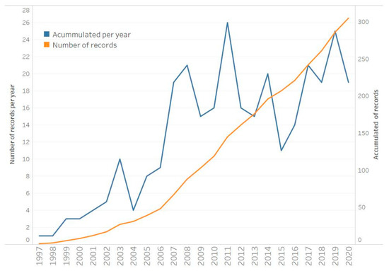 The first report is about the number of articles published on knowledge sharing in business education. The range of publication goes from 1997 to 2020 and is presented in Figure 1. Based on the traditional lifecycle methodology, articles per year were taken as a measure of growth. The figure shows the evolution in the development of the topic knowledge sharing in business education. In this sense, it was found that between 1997 and 2002, this field went through an initial phase of low scientific production and from 2003 to 2020, it has been in a growth phase characterized by a relevant production of knowledge, except in the years 2004, 2009 and 2015.