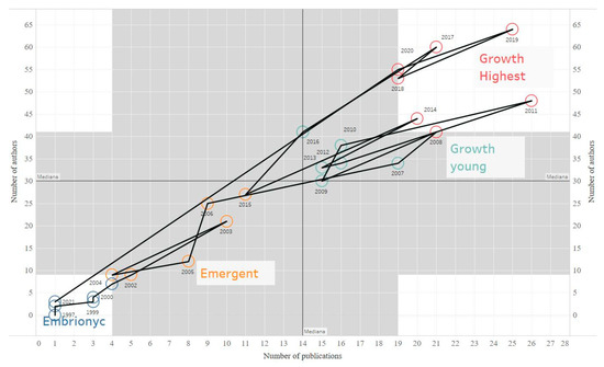 The first stage, the embryonic, presented the beginning of the study of knowledge sharing in business education. This stage occurred between 1997 and 2001 (color blue in Figure 3). The average number of authors and articles shows the slow growth characteristic of this period. The second stage, emerging, began in 2002 and lasted until 2006 and returned in 2015 (color orange in Figure 3). The average number of publications in this phase was 19 per year and the average number of authors was 17, showing growth compared to the previous stage. In the following years, there were transitions in the stages of growth young and growth highest. The growth young stage occurred in 2007, 2009, 2010, 2012, 2013 and 2016, with an average of 19 articles and 35 authors per year (color green in Figure 3). The growth highest stage occurred in the years 2008, 2011, 2014, 2017, 2018, 2019 and 2020 (color red in Figure 3).