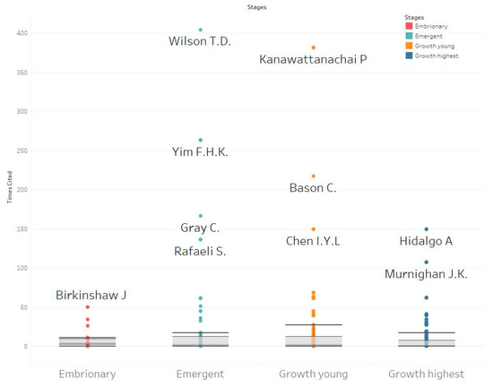Figure 4 presents the most important authors in the four proposed stages using two bibliometric indicators—the number of publications (X-axis) and the accumulated citations (Y-axis). In the embryonic stage, the two authors with the highest number of accumulated citations were Birkinshaw [83] with the work entitled “why is knowledge management so difficult?” and the one of Cheng [84]. In the emerging stage, the most cited authors were Wilson [85] with a critical article on knowledge management and Gray [86]. In the growth young stage, the most cited authors and works were Kanawattanachai [71], which is about the impact of knowledge coordination on virtual teams, and Bason [87], on public sector innovation. In this stage, Chen [73,86] stood out for the number of studies, especially the article about college students’ use of e-learning systems. In the highest stage of growth, the most cited authors were Hidalgo and Albors [88] about innovation techniques, and the author with the highest number of articles was Doctor [89,90,91], with works on users of knowledge repositories in a management institute, the dynamics of knowledge sharing in a management institute, and capturing intellectual capital in a business school institution.