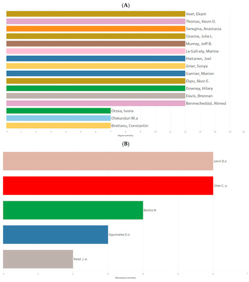 Key authors by coauthorship network by degree centrality (A) and betweenness centrality (B).