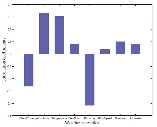 Weather attributes employed in this paper have been summarized in Table 1. Their selection for model input completely relies on the information availability and degree of correlation with target output. Consequently, the correlation coefficient of all the eight weather parameters with solar power output is first measured and depicted in Figure 3. It follows from this figure that both visibility and temperature are mildly positively correlated with solar power, while cloud coverage and humidity are mildly negatively correlated with solar power. Additionally, other weather variables with relatively weaker correlation, including dew point, wind speed, pressure, and altimeter, should not be neglected. Only several major influencing factors are considered in most of the existing SPF methods. However, it is unreasonable to only incorporate the most important weather variables into the model input since various environmental conditions have caused different degrees of impact on solar power generation. Therefore, benefiting from the high-dimensional weather data, performance improvement can be achieved despite the higher training time cost, which can be ignored because of the offline training and speedy prediction.