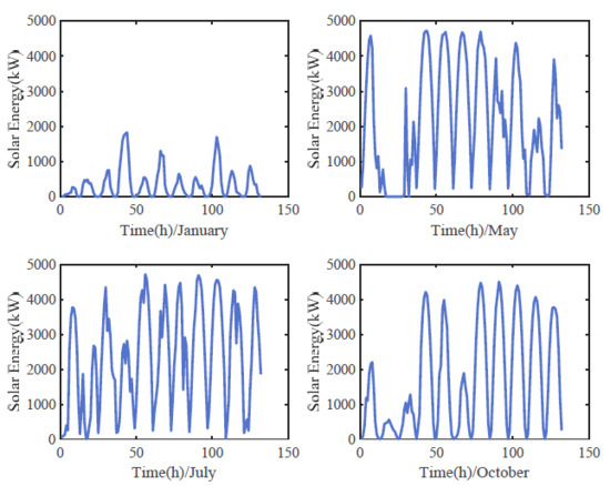 The previous section has revealed that a meaningful attempt is to comprehensively use weather information and time element for SPF. Because of the earth’s rotation, solar power generation at a specific hour of a day shows considerable time correlation, i.e., daily regularity. To intuitively display this feature, representing the four seasons in 2017, data from 10 January to 20 January, from 10 May to 20 May, from 10 July to 20 July, and from 10 October to 20 October are selected to depict the distribution of daily solar power generation, which is shown in Figure 4. Only during the period from 6:00 am to 5:00 pm is the sunshine duration, zero observations of nightly energy are negligible here. It is observed that the power output exhibits similar behavior among the days (uniform variance trend), while it exhibits diverse and irregular behavior under the terrible or rapidly variational weather conditions (abrupt turning points occurring at the hour other than 12:00 am). In regular cases, solar power generates from the beginning of a day, and then gradually increases until it peaks at noon (12:00 am), finally declines to zero as evening approaches, which distinctly implies that the solar power output is considerably pertinent to the hour of the day. To numerically present the time correlation, the correlation coefficient of the time variable with solar power output is calculated as 0.1692. Due to the limited data support, not only daily regularity but similar monthly and even annual behavior can be found and discussed.