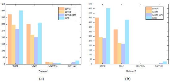 The advancement of the introduced LSTM and the superiority of the proposed LSTM-GPR are confirmed by the comparison with other algorithms, including BPNN, individual LSTM, and GPR. It is worth noting that the same input-output structure as the hybrid model is implemented in BPNN and individual LSTM and GPR, while GPR of the hybrid model executes the second prediction between the first results forecasted by LSTM and observations.