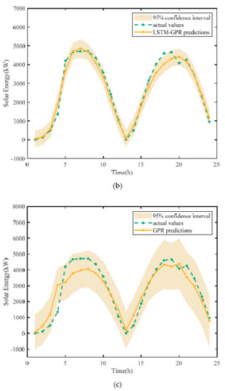 In addition, it can be found that the prediction interval is relatively wider at the volatility of solar power. Furthermore, LSTM-GPR fails in timely tracking the variability of solar power, which may be solved by constructing the complex kernel function of GPR.