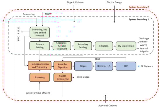 Diagram of the studied WWTP and the dynamic system boundaries considered. The gray shadow area outlined with a dashed gray line refers to the treatment of the liquid phase only (System boundary 1), dashed red line refers to the treatment of liquid (green boxes) and solid (brown boxes) phases and includes the cogeneration of biogas (blue boxes) for electric energy production (System boundary 2).