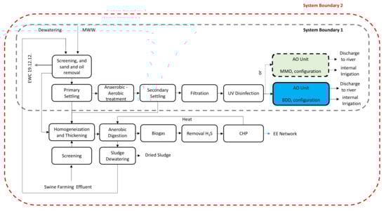 Diagram of the implementation of the Anodic Oxidation (AO) unit at the studied Wastewater Treatment Plant (WWTP). The blue box refers to Boron-Doped Diamond (BDD) anodic configuration, and the green box refers to Mixed Metal Oxides (MMO) anodic configuration. The gray shadow area outlined with a dashed gray line refers to the treatment of the liquid phase only (System boundary 1), while the dashed red line refers to the treatment of liquid and solid phases (System boundary 2).