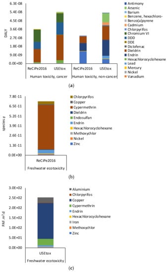- Bijster, M.; Guignard, C.; Hauschild, M.; Huijbregts, M.; Jolliet, O.; Kounina, A.; Magaud, V.; Margni, M.; McKone, T.; Posthuma, L.; et al. USEtox 2.0 Documentation (Version 1.1); Fantke, P., Ed.; USEtox® International Centre: Lyngby, Denmark, 2018. [Google Scholar]