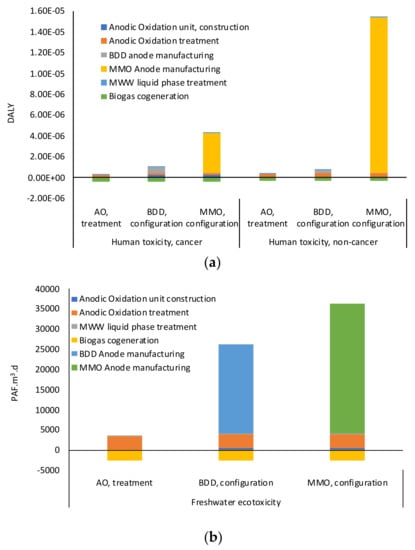 Table 5 reports the comparison of the environmental burdens associated with the treatment of MWW liquid fraction in the presence of PP to the environmental burdens obtained when the AO unit is implemented as a tertiary treatment process (System Boundary 1) (Figure 2).