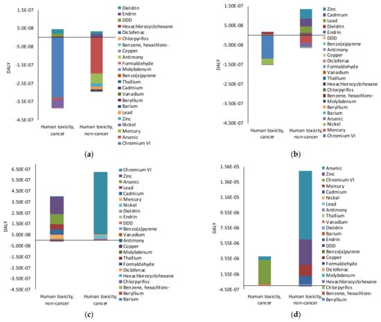 It must be noticed that chromium VI contributes to Human Carcinogenic Toxicity by 6.79% and zinc contributes to Human Non-Carcinogenic Toxicity by 36.7%. The impacts associated with these two heavy metals can be related to the indirect extraction of fossil fuels for electric energy production.