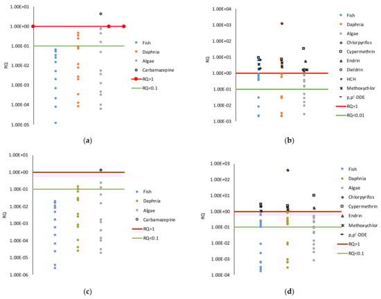 Considering an average PP removal efficiency of 70%, the environmental risks associated with chlorpyrifos, methoxychlor, p,p’-DDE, and endrin continue to be characterized by RQs > 1 for at least one trophic level, and the RQ of carbamazepine remains slightly higher than 1 for algae trophic level.