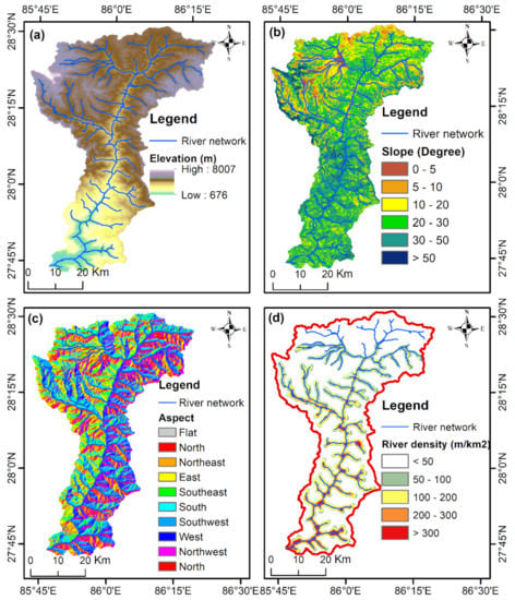 Topographical characteristics: (a) elevation, (b) slope, (c) aspect, (d) river density.