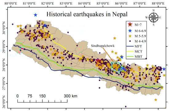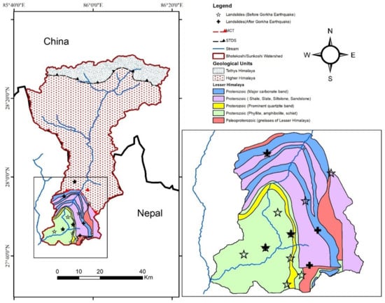 The geological characteristics of any basin have great significance on the occurrence, intensity, and effects of multiple geohazards. To understand the geological setting and complexities of the study area, regional scale geological maps were reviewed and modified thoroughly. Information on the major rock type, lithological units, and major thrusts were gathered from published literature [,] and overlaid with major landslide events [] using GIS. Major historical seismic events were thoroughly reviewed and analyzed to correlate the effect of seismic events on the occurrence of multiple geohazards, especially landslides and landslide dam outburst flood (LDOF).