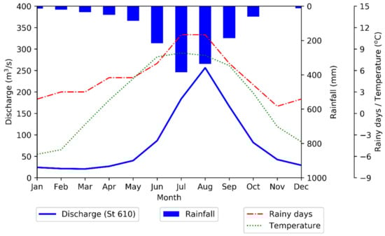 Mean monthly discharge at Bahrabise station (Station no.: 610) and basin-averaged mean monthly rainfall (inverted y-axis at right), and rainy days and average temperature (offset right axis) of the study area. Monthly discharge data for Bahrabise station is computed from the data maintained by the Department of Hydrology and Meteorology (DHM), basin-averaged rainfall and rainy days are computed from the CHIRPS data using 94 grid points and basin-averaged temperature is computed from the WorldClim data.