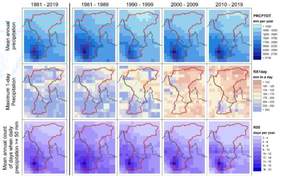 Spatial distributions of mean annual precipitation (at top panel), maximum 1-day precipitation (at middle panel) and mean annual count of days when daily precipitation ≥50 mm (at bottom panel) for the entire selected period (1981–2019 at the left), and for different four decades: 1981–1989, 1990–1999, 2000–2009, and 2010–2019 (left to right, respectively). The daily precipitation data are obtained from CHIRPS dataset at a spatial resolution of 0.05° (~5 km).
