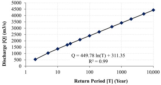 We further characterized the average annual as well as seasonal discharge and their trends over the years based on the observed discharge at the outlet of the watershed (Bahrabise, index: 610). The average annual discharge of 1965–2006 is 81.1 m3/s, with variations over the months from 20.6 m3/s (in March) to 255.4 m3/s (in August). The recorded average monthly discharge for the month of highest flow varies from 145.7 to 846.5 m3/s. Furthermore, the instantaneous flood time series for the 35 years spanning from 1965 to 2006 ranges from 292 to 1030 m3/s, with an average value of 614 m3/s. Flood frequency analysis using Gumbel distribution showed that floods of the return periods 100, 500, 1000, and 10,000 floods at the outlet of the watershed are 2401 m3/s, 3112 m3/s, 3417 m3/s, and 4430 m3/s, respectively (Figure 7).