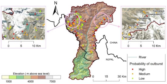 Location of glacial lakes (count = 108) across the study area and their probability of flood shown in three levels: high, medium, and low. The shaded is topography and hill shade. The elevation of these glacial lakes ranges from 4102 m asl (meters above sea level) to 5615 m asl. There are 17 glacial lakes with high probability of flooding. Two insets are representative areas superimposed with google image as a base map.