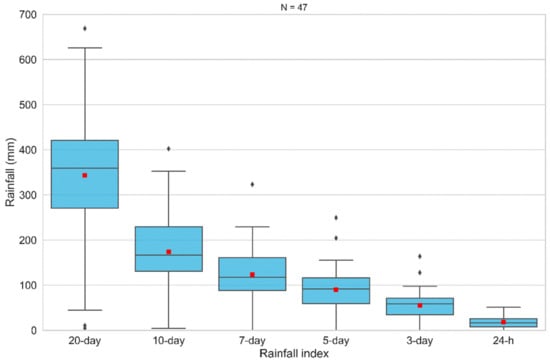 Boxplot showing the variation of different rainfall index based on cumulative rainfall (20-day, 10-day, 7-day, 5-day, 3-day and 24-h) before the occurrence of landslide based on daily rainfall data. No. of landslides (n) used in this study is 47 that occurred inside the study basin around Nepal side. Red square indicates the average value and boxplot shows quantiles (Q1 and Q3), median (Q2) and range of variation.