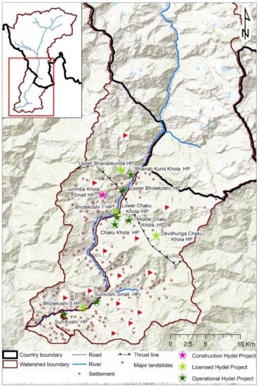 Despite susceptibilities to multiple natural hazards, the existence of much critical infrastructure, such as the hydropower stations, in the study area prompts more rigorous multihazard studies. As shown in Figure 16, 10 hydropower projects are either in operation or being constructed in the region where seismic activity is very frequent. The 2020 disaster incidents have proved how landslides induced by torrential rainfall and subsequent incidents affect lives, livelihoods and built environment in the study district. Owing to this sensitive scenario, stakeholders should reframe the current practices either in terms of added safety levels considering multiple natural hazards and their cascading impacts or the relocation of critical infrastructure. For example, in the case of GLOF, most of the bridge infrastructure would be swept away, as conventional bridge design and construction practice does not incorporate the scenarios that would be created by GLOF. In mountainous terrains, bridges would be easily swept away due to torrential rainfall led flash floods, as reported by Gautam and Dong []. The case would be more pronounced in the case of the BSW due to the fact that the Arniko Highway is one of the major lifelines that connect Nepal and China.