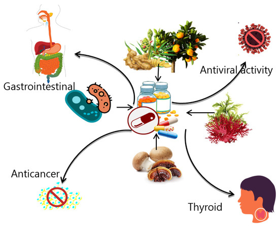 Seaweed bioactive metabolites have been consumed for many years in different cuisines [84]. Technologies that may improve the production of seaweed molecules are also previously discussed [85]. The brown seaweed polysaccharide fucoidan has immunomodulatory properties by modulating T cells and decreasing cytokines like interleukin 6 (IL6) [86]. A promising functional drink product from the brown seaweed Sargassum binderi tea contains fucoidan exhibits antioxidant activity [87]. Fucoidan from other species like wakame Undaria pinnatifida showed anticancer and antioxidant properties [88], anticoagulant [88], and antioxidant properties [89]. Generally, seaweed is known as a great source of some essential elements like iron and iodine [90]. High concentrations of minerals such as iron, cadmium, and zinc were found in a group of different Mediterranean seaweed species like Gracilaria verrucosa, Codium tomentosum, and Sargassum linifolium with high potential to be used in the nutritional supplement industry [91]. However, the content of those minerals depends not only on the species but also on the geographical distributions and environmental conditions [92]; therefore, the assessment of the content and potential human toxicity should be a routine procedure for those species selected for health supplements and the food processing industry. Brown seaweed Dictyota friabilis showed potential antiviral properties against HIV [93]. Besides Dictoyta spp., Turbinaria decurrens using an in vitro metabolomics study also revealed anti-HIV activity for polysaccharides extracted from these species [94]. Dictyota menstrualis showed inhibition activity against Zika virus in Brazil [95]. This property of antiviral activity of the seaweed extracts/products related to bioactive secondary metabolites has promising applications to fight different viruses, making these different species of seaweeds a target for the supplement/drug development process and thus increasing their values.