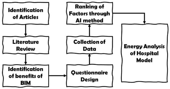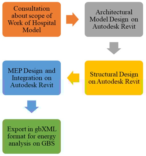 Autodesk Revit was used to develop the model for energy analysis on GBS. The model of the hospital was developed after the consultation of the stakeholders. The architectural, structural, and MEP model was developed on Autodesk Revit. The model was exported in gbXML format from Autodesk Revit, which is a required data exchange format for analysis on GBS. The hospital model is designed with Level of Detail (LOD) 300 and by looking at structural safety and sustainability practices. The building has a gross floor area of 3562.6 m2 and a base floor area of 815.65 m2. Keeping these principles in mind, the model was designed with a structural framing system made up from concrete, which amounts to 1334.981 cubic meters. The recyclable bricks were used to construct walls, as such bricks are sustainable in the long run and can be recovered, reused, and recycled for new projects [50]. Figure 2 shows the steps which were followed for the model development. GBS, which is a cloud-based software, uses data from the nearest weather station for energy analysis. The carbon emission calculations are based upon the onsite material and energy use, the source of production of electricity which is to be used during the operational phase, and it can be based on fossil fuels or renewables. A higher percentage of carbon emissions shows that electricity production used for that project is based majorly on fossil fuels. The project considered in this research work is in Hyderabad, Pakistan, where the peak temperatures are around 45 °C in summer. The same temperatures were used by GBS for analysis. Rates used for calculation of cost were taken from local energy suppliers in Hyderabad which are set by the government for the hospital buildings.