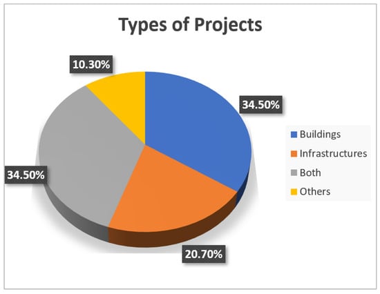 The survey respondents with industry professional experience had undertaken various projects such as buildings, infrastructures, build-infrastructures, etc., as shown in Figure 4.