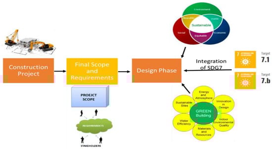 Typically, construction projects are conventionally executed after thorough planning. Still, due to recent environmental threats, new approaches are needed to optimize the use of resources during the planning and design phases. It is highly recommended in the United Nations’ SDGs to design new trends to save natural resources depletion. This study proposes a solution that can be integrated during the construction industry project’s design phase to achieve various benefits mentioned in earlier sections. This model incorporates the various indicators considered in sustainable structures, green buildings, and SDG 7 during the building design phases. Now, it is evident that conventional building design approaches cannot integrate all the indicators. Therefore, this study provides an integrated approach between these tools, sustainability indicators, and green building concepts. Figure 5 and Figure 6 show the complete conceptual framework.