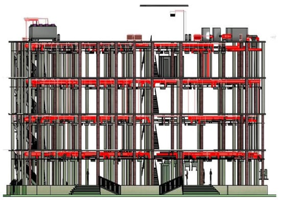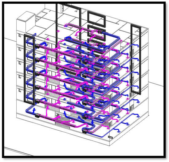 The model shows the complete structural key elements of the building, and appropriate sections are also added in the model. Similarly, the whole Mechanical Electrical and Plumbing (MEP) model was created, and the complete drawing is shown in Figure 8.