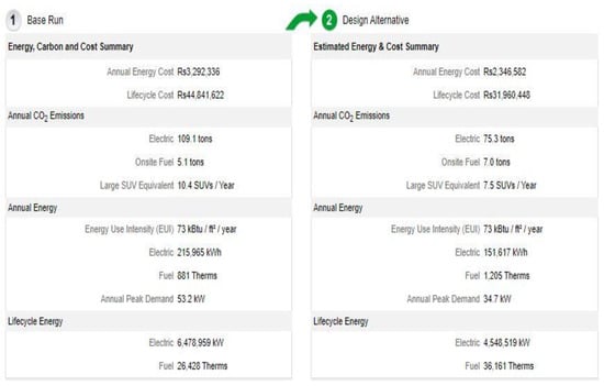 The former is without any changes in the building design. The later result is after changing the building’s orientation at 15° with alteration in the HVAC system to the underfloor air distribution system and the use of low emissivity glazing on windows. The glazing allows the visible light to pass through the glass, but reflects the heat, reducing the use of electricity for internal cooling or heating [53]. The authors [54] stated that the underfloor air distribution system is energy efficient and improves the living environment for occupants as well. The best design alternative results also prove the statements that the use of an underfloor air distribution system with low E glazing of windows reduces the energy use and cost significantly. This reduction in energy use also has a major impact on reducing carbon emission. The results show that 32 tons of carbon emission can be achieved by doing these changes. The design alternative to reach the optimum design and energy efficiency can reduce the annual peak demand from 53.2 KW to 34.7 KW and reduce electricity use, as it is costly in a developing country like Pakistan. This reduces annual peak demand and grid electricity use, which can be further reduced by using the PV system on the roof of the building, reducing the carbon emissions further. These interventions also proved effective for annual and lifecycle energy cost. The anticipated annual energy cost after the changes was reduced by almost 1 million rupees, and lifecycle energy cost was reduced by almost 13 million rupees. The summarized optimization results are also represented in Table 6. It is observed from Table 6 that there is a significant saving of resources using the suggested approach mentioned in this paper.