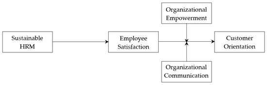 From the perspective of internal marketing, we considered human resource management (HRM) practices as the most influential antecedents for employee satisfaction. In particular, we focused on sustainable HRM practices, described as the “adoption of HRM strategies and practices that enable the achievement of financial, social, and ecological goals, with an impact inside and outside of the organization and over a long-term time horizon while controlling for unintended side effects and negative feedback” [13]. Sustainable HRM focuses on creating competitive advantages for organizations by regenerating and developing human resources [14,15]. Based on the notion of sustainable HRM, we decided to adopt the three facets of training, reward, and benefit [16]. Social exchange theory could also be valuable for explaining the relationship between employees’ satisfaction and their customer orientation. According to this theory, employees who perceive beneficial supports from their organization are likely to actively contribute in terms of a reciprocal attitude or behavior [17]. In this study, we also emphasized organizational empowerment and organizational communication as FLE-supportive contexts. FLEs should promptly and appropriately respond to customers’ demands and complaints at the service encounter themselves. Even if satisfied FLEs benefit from sustainable HRM practices, it is difficult to commit to customer orientation if they do not have discretion for decision making and helpful information, leading to unexpected service situations through organizational empowerment and communication. Self-determination theory highlights the importance of autonomy and relatedness for improving employee motivation [18]. We next discuss our conceptual framework.