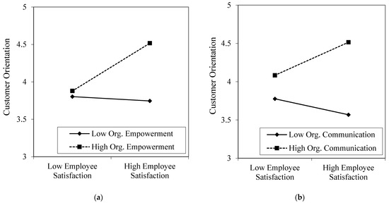 To shed light on the moderating roles of organizational empowerment and communication between employee satisfaction and customer orientation, we plotted the simple slopes for the two interaction terms. First, we divided the samples into high and low groups each for organizational empowerment and communication by one standard deviation above and below the mean value [53]. We then performed the simple slope test to check the significance of the two slopes by group [54]. Figure 2 indicates the results. In the group that perceived high organizational empowerment, employee satisfaction and customer orientation showed a significantly positive relationship (b = 0.29, S.E. = 0.09, t = 30.16, p < 0.01); however, there was no significant relationship for the group that perceived low organizational empowerment (b = −0.02, S.E. = 0.08, t = −0.24, p < 0.75). In the group that perceived high organizational communication, employee satisfaction and customer orientation showed a significantly positive relationship (b = 0.17, S.E. = 0.08, t = 10.92, p < 0.05); however, there was no significant relationship for the group that perceived low organizational communication (b = −0.06, S.E. = 0.09, t = −0.61, p < 0.54). Thus, it can be understood that employee satisfaction is positively related to customer orientation only when organizational empowerment or communication is highly perceived.