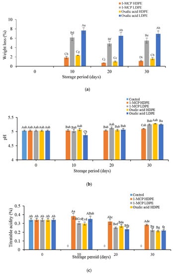 Different physicochemical properties, including weight loss, pH, and titratable acidity, along with total sugar of litchi fruits treated with oxalic acid and 1-MCP in LDPE and HDPE, are presented in Figure 1. The untreated (control) samples were fresh up to 6 days during the whole storage period.