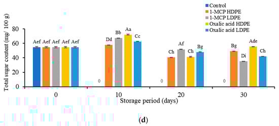 Each treated fruit’s total sugar content increased at ten days then decreased progressively except for 1-MCP and oxalic acid treated in HDPE at 30 days (Figure 1d). Higher total sugar contents were found in fruits treated with oxalic acid (55.53 mg/100 g) and 1-MCP (49.07 mg/100 g) in HDPE-treated fruits, than those fruits treated with 1-MCP (35.06 mg/100 g) and oxalic acid (42.01 mg/100 g) in LDPE at 30 days. Hailu et al. (2012) [21] have reported that the total sugar content of guava fruits was higher in HDPE than LDPE. The increase in total sugar is because of the conversion of complex starch to simple sucrose and the conversion of polysaccharides to soluble solids [22]. The overall sugar levels can be decreased by 1-MCP owing to delayed maturation. Total sugar content decreased may be due to the breakdown of sugar during the respiration phase [23].