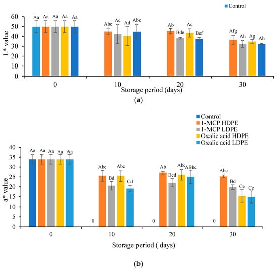 Changes of pericarp color value of litchi fruits treated with 1-MCP and oxalic acid in HDPE and LDPE during storage. (a) L*, (b) a*, and (c) b* 1-MCP=1-methylcyclopropane; HDPE=High Density Polyethylene; LDPE=Low Density Polyethylene. Different uppercase letters (A–D) indicate significant (p ≤ 0.05) differences among treatments. Different lowercase letters (a–h) indicate significant (p ≤ 0.05) differences among storage periods.