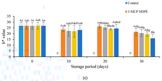 The L* (lightness) values of all treated fruits decreased throughout the storage period. On the other hand, a* and b* values increased at 20 days followed by a decline in the rest of the days (Figure 2). 1-MCP-treated fruits had higher L*, a*, and b * values than those of other treatments throughout storage period. These results are in agreement with a previous study, wherein pericarp color values of litchi were retained [5]. HDPE-treated fruits tended to display higher L* values relative to LDPE-treated fruits, although all values were not significantly different at 30 days of storage. Rao and Shivashankara (2015) [24] also reported that the plastic bag (HDPE) due to the combined effect of increased humidity and altered atmospheric composition can delay color change in broccoli. In this study, the decreased L* values suggested the reduced lightness of the litchi pericarp surface color, which may be linked to pericarp browning. The oxidation of pericarp phenolic compound by polyphenol peroxidase (PPO) and peroxidase (POD) could have led to litchi pericarp browning [25]. Moreover, the reduction in a* (redness) and b* (yellowness) values could be due to the degradation of the pericarp anthocyanin content [25]. Based on visual appearance, 1-MCP in HDPE-treated fruits maintained better pericarp color than other treatments (Appendix A Scheme A1).