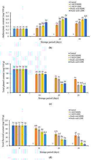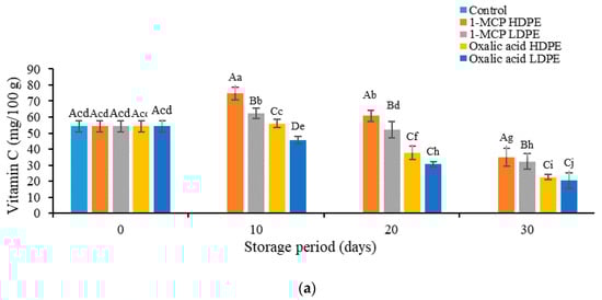 The higher levels of vitamin C (ascorbic acid) were found in fruits treated with HDPE (74.73–34.95 mg/100 g) rather than in 1-MCP in LDPE treatments (62.37–32.26 mg/100 g), oxalic acid in HDPE treatments (55.91–22.58 mg/100 g), and oxalic acid in LDPE treatments (45.70–20.43 mg/100 g) (Figure 3a). Liu et al. (2015) [26] have reported that the use of 1-MCP on peach lowers the gene expression of ascorbate peroxidase (main oxidative enzyme) precursor synthesis, thereby maintaining the high levels of vitamin C content. In another study, Sivakumer et al. (2012) [12] also found higher levels of vitamin C content in 1-MCP-treated mango fruits. Arthey and Philip (2005) [27] reported that HDPE containers retained higher vitamin C levels in apricot. The higher levels of vitamin C content retained during storage is due to the prevention of oxidative deterioration of vitamin C [28]. It is known that vitamin C content is influenced by temperature, light, heat, and pH [28]. The storage temperature also influences phenolics, anthocyanins, and vitamin C as reported by Kalt et al. (1999) [29].