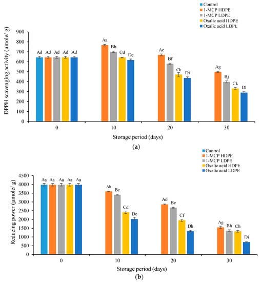 Fruits treated with 1-MCP in HDPE had maximal DPPH scavenging activity (497.701–766.667 μmol/g) compared with fruits treated with 1-MCP in LDPE (398.851–700 μmol/g), oxalic acid in HDPE (331.034–642.529 μmol/g), and oxalic acid in LDPE (290.804–617.24 μmol/g) over the entire storage process (Figure 4a). Hasan and Mahfouz (2012) [41] have reported higher DPPH scavenging activity for 1-MCP treatment of coriander leaves. Kolniak et al. (2014) [42] reported a reduction in the loss of DPPH activity in apples by 1-MCP during storage. Ramli and Ahmed (2017) [43] also observed higher antioxidant (DPPH) activity in curry leaves packaged in HDPE. In this study, the suppression of anthocyanin, phenolic, and ascorbic oxidation could have increased the DPPH antioxidant activity. The DPPH radical scavenging activity may be related to total phenolic content [44]. In the case of HDPE, fruits treated with 1-MCP had considerably (p ≤ 0.05) higher reducing power (1544.444 μmol/g) than oxalic acid in LDPE (705.556 μmol/g), 1-MCP in LDPE (1355.556 μmol/g), and oxalic acid in HDPE (1322.222 μmol/g) at 30 days (Figure 4b). Chang et al. (2002) [45] reported that antioxidant activity is correlated with reducing power. Cao et al. (2011) [33] have also confirmed that 1-MCP fruit treatment prevents the decrease in reducing power, thereby retaining higher reducing power values. Several bioactive compounds (ascorbic acid, anthocyanins, phenol, and flavonoid content) could have contributed to this study’s higher reducing power reduction. However, the loss of reducing power is related to the oxidation of polyphenolic compounds, complex formation with other food components, or transformation from active polyphenols to inactive compounds [46].