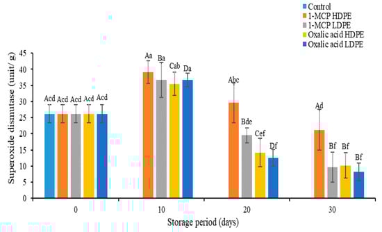 Superoxide dismutase (SOD) activity of all treated fruits dramatically increased at 10 days, followed by a gradual decrease during the rest of the storage period. Fruits treated with 1-MCP in HDPE retained higher superoxide dismutase (SOD) activity (39.08–21.23 units/g) compared to oxalic acid in HDPE (35.50–10.16 units/g), oxalic acid in LDPE (36.7–8.17 units/g), and 1-MCP in LDPE (36.64–9.68 units/g) up to 30 days (Figure 5). Results indicate that 1-MCP treatment may induce and enhance SOD activities. Yun et al. (2021) [47] found that hot water treatment significantly reduced SOD activity of litchi fruit. Massolo et al. (2011) have found similar findings in eggplants [48]. Duan et al. (2011) [49] indicated that superoxide dismutase (SOD) is a detoxifying enzyme that could also lead to delayed senescence in the scavenging of superoxide dismutase (SOD) enzymes. Higher superoxide dismutase (SOD) enzymes can reduce lipid peroxidation and electrolyte leakage [3,50].