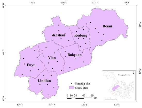 The research was conducted in seven counties and cities located in the black soil region in northeast China: Baoquan County (BQ), Kedong County (KD), Keshan County (KS), Beian City (BA), Yian County (YA), Lindian County (LD), and Fuyu County (FY) (Figure 1). The geographic coordinates of the study area ranged from 46°49′12″ to 48°32′24″ N and from 123°59′24″ to 127°52′12″ E with a total area of 27,479.3 km2. The climate is classified as a temperate semi-humid continental monsoon climate, with four seasons in a year: rainy and hot summers, cold winters, and dry and windy springs and autumns. The annual average temperature is 1.2–2.6 °C. The annual mean total precipitation is 455–490 mm, and the annual mean evaporation is 440–450 mm. The annual average wind speed is 3.1 m/s. April and May are the windiest months of the year, with a month-average wind speed of 4.5 m/s and a maximum wind speed of 22 m/s in April. Annually, there is an average of 72 days with a wind level of or above level V (>8.0 m/s), making up 51% of all windy days each year. The topography of the region is undulating tableland, with wide valleys and hills and long and gentle slopes. The elevation lowers from the northeast to the southwest, ranging from 145 to 300 m above sea level (some un-sampled forested areas in Beian City have elevations of 460 m). The soil in the region mainly consists of black soil and chernozem. Kedong, Keshang, and Baiquan Counties have typical black soil; Yian and Lindian Counties have a mixture of black soil and chernozem; and Beian City and Fuyu County have black soil and chernozem, along with some gleysols, luvisols, and organic soil. The most common land usage in the area is agriculture. Farmland area takes up over 69.6% of the total land area.