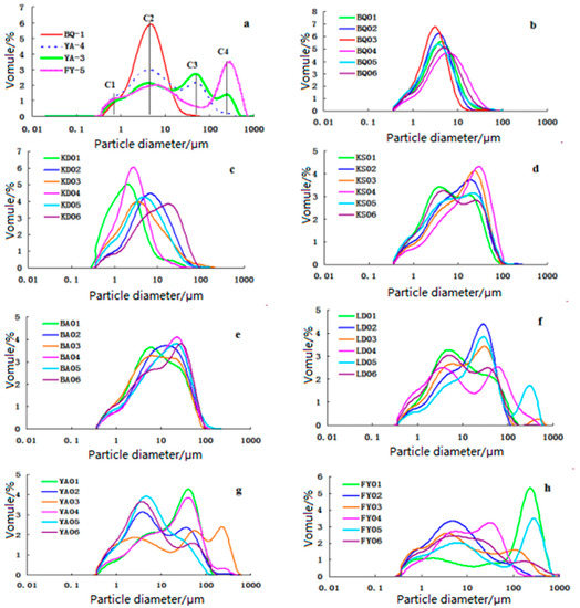 Figure 2b–h are the soil particle size frequency curves of samples from seven locations. All frequency curves displayed polymodal characteristics with relatively clear locational differences. Particle size frequency curves of BQ and KD displayed a near-symmetrical lightly right-skewed bi-modal distribution (Figure 2b,c) with good soil sortability (better sortability in BQ than in KD). The main peaks in the curves represent the high-content C2, and the secondary peaks represent the lower-content C1. Frequency curves of KS and BA showed a tri-modal distribution (Figure 2d,e), with the two main peaks representing C2 and C3 (both high-content), and the secondary peak representing low-content C1. Frequency curves in LD, YA, and FY showed quad-modal distribution (Figure 2f–h) with poor soil sortability. In LD and YA frequency curves, the main peaks represented C2 and C3 and the secondary peaks, C4 and C1. In the frequency curves of FY, the main peak represented C4, and the secondary peaks were C2, C3, and C1 components.